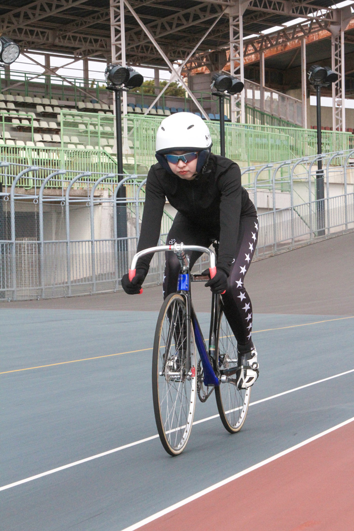 自転車経験のない適正試験合格者は、入所前トレーニング(自主練)でまず競輪の『イロハ』を覚える。午前中はスポーツジムで筋トレや長距離ロード。午後は豊橋競輪のバンクでT‐GUP(豊橋ガールズケイリン育成プロジェクト)の練習生たちとラインを組み、逃げや刺しの駆け引きや位置取り、仕掛けるタイミング、そして判断力や勝負勘などを身体に叩き込む。「最初はコーナーの傾斜(カント)が怖くて。脚力には多少自信があったのですが、スピード練習時は毎回息が上がって身体が悲鳴をあげます」。身長170cmで脚も長いが「線が細くてパワーが足りない。食事量や筋トレで肉体改造しなければ」。少年野球時代からの友人で同学年の牛田樹希斗選手(A級2班)は「伸びしろがあり、技術吸収が早い。男勝りな性格もケイリン向き」と期待する。