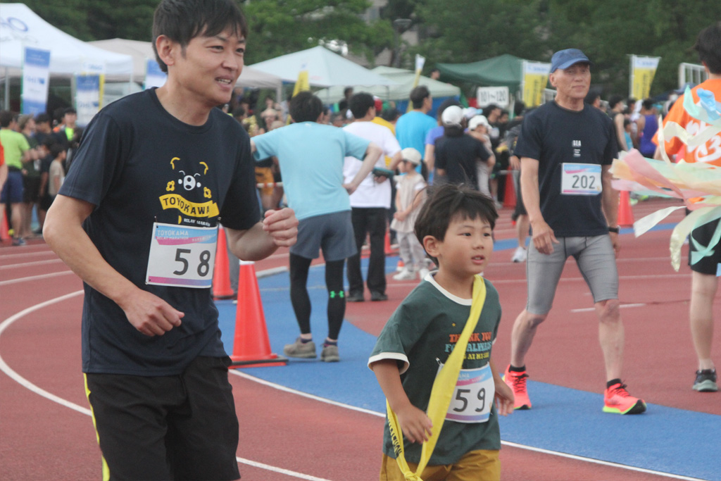 タスキを通して繋がる絆ーをスローガンに、チームで42・195㌔を走破する「豊川リレーマラソン2024」が2日、同市陸上競技場を発着点に開かれ、一般、ファミリー、職場仲間、マスターズなど9部門に県内外から412チーム3275人がエントリー。1周2㌔の周回コースを駆け抜けた。