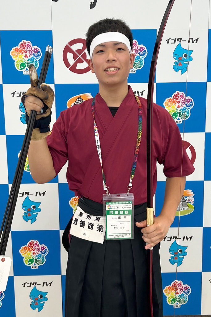 「ありがとう」を強さに変えて、有言実行Vー。豊橋商業高校3年の野本歩夢君は、長崎県島原市で開催された全国高校総体(インターハイ、北部九州総体)の弓道競技男子個人戦で優勝を飾った。過去団体戦での全国制覇はあるが、個人での日本一は男女合わせて初の快挙。「応援を力に120%の実力を発揮することができた。(優勝を)口にはしてきたが、まさか実現できるとは。自分が1番驚いています」と声を弾ませる。同部は団体戦、個人戦の男女4部門で全国に乗り込み、いずれも予選を通過するなど愛知県代表として胸を張れる成績を残した。